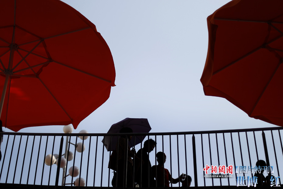 紅色象征著熱量與活力,紅色也象征著興奮與激情,在世博園區(qū)內(nèi)游覽,總會(huì)有一抹濃艷的紅色闖入到記者鏡頭之中,讓世博變得更加火辣。圖為紅傘下的游客。中新社記者 盛佳鵬 攝