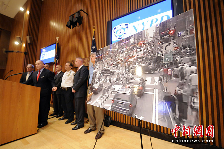 美國(guó)當(dāng)?shù)貢r(shí)間5月2日,紐約市警察局長(zhǎng)凱利在記者會(huì)上公布了紐約時(shí)代廣場(chǎng)爆炸事件現(xiàn)場(chǎng)照片。同時(shí)他還指出,沒(méi)有證據(jù)顯示巴基斯坦塔利班策劃了1日傍晚發(fā)生在紐約時(shí)報(bào)廣場(chǎng)上的未遂汽車(chē)炸彈襲擊事件。圖片來(lái)源:中國(guó)新聞網(wǎng)