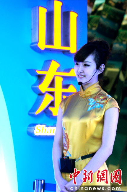 5月3日,上海世博會(huì)中國(guó)山東館一位禮儀小姐始終笑容可掬,許多參觀者都喜歡與外秀內(nèi)慧的她拍一張留影照。當(dāng)一對(duì)夫婦推著嬰兒車(chē)經(jīng)過(guò)時(shí),她迅速上前幫助抬下階梯。她因而享有全場(chǎng)最善解人意的禮儀小姐美稱。中新社發(fā) 賈國(guó)榮 攝