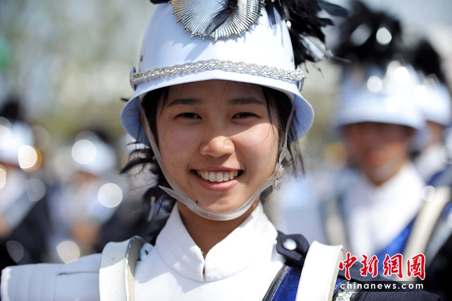 來自泰國(guó)南邦甘拉雅尼步操樂團(tuán)的美少女,在上海世博會(huì)園區(qū)舉行的“歡樂盛裝大巡游”中引人注目。中新社發(fā) 陳文 攝