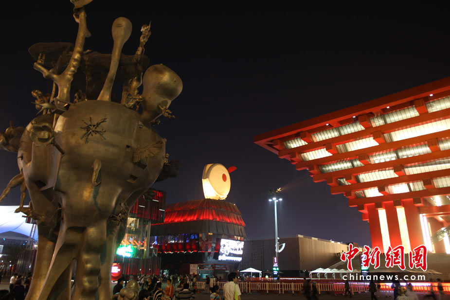夜幕下的上海世博園區(qū)處處流露光華與璀璨,圖為中國館與一尊雕塑之間的澳門館。中新社發(fā) 宗金柱 攝