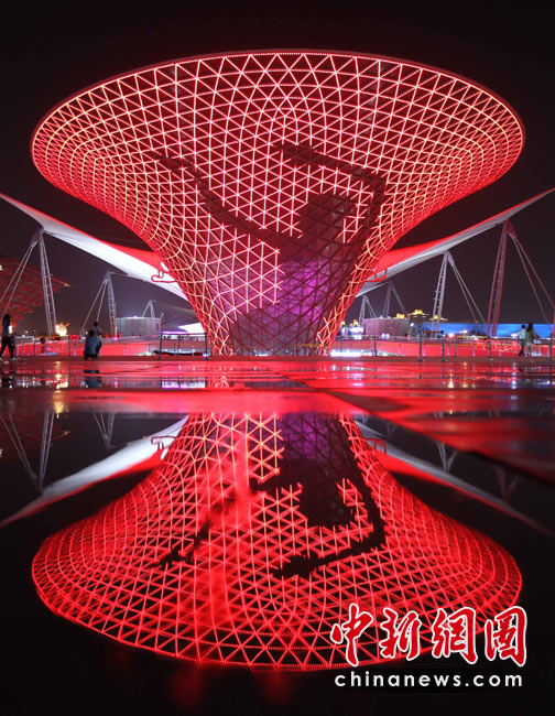 夜幕下的上海世博園區(qū)處處流露光華與璀璨,世博軸上的“陽光谷”成為一個個流光溢彩的“夜光杯”,以不同色調(diào)交織成流動的光影旋律,給游客們帶來難以忘懷的感受。圖為“陽光谷”上顯示出一個舞蹈女子的燈光圖案。中新社發(fā) 宗金柱 攝