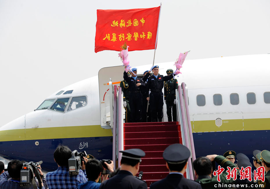 5月4日,中國第八支赴海地維和警察防暴隊(duì)全體隊(duì)員乘坐聯(lián)合國包機(jī)返回祖國。公安部副部長孟宏偉、政治部主任蔡安季前往機(jī)場(chǎng)迎接。 中新社發(fā) 劉震 攝