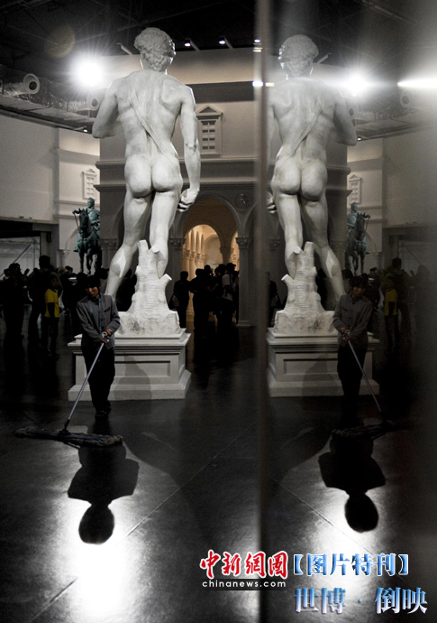 城市足跡館里,鏡中倒映著大衛(wèi)雕像。中新社記者 廖攀 攝