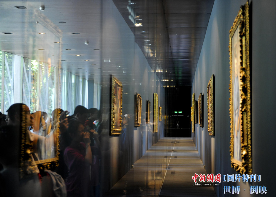 世博園法國(guó)館內(nèi),游客拍攝著玻璃罩內(nèi)的國(guó)寶油畫。中新社記者 廖攀 攝