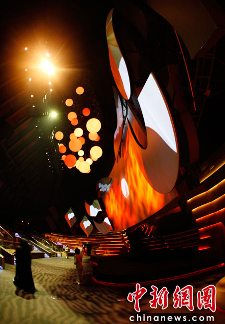 2010年5月4日,上海世博園區(qū)迎來(lái)首個(gè)平日票的參觀客潮。圖為準(zhǔn)備好迎接游客的阿聯(lián)酋館的影院。中新社發(fā) 盛佳鵬 攝