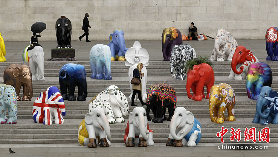 5月4日,2010年倫敦大象游行活動當日在特拉法爾加廣場啟動。260個真象大小的彩繪雕塑將在倫敦各處展出,并將于6月30日拍賣為慈善組織籌款。圖片來源:中國新聞網(wǎng)