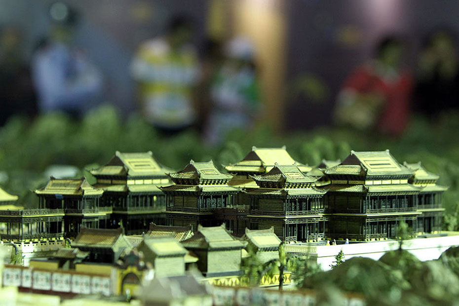 5月4日,游客在參觀縮微版“圓明園”。近日,一座“全景式巨型立雕圓明園”在上海世博會世界貿(mào)易中心協(xié)會館亮相。這座縮微版的“圓明園”以1比150的比例制作而成,再現(xiàn)了全盛時期的圓明園雄偉壯觀的全景。圖片來源:新華網(wǎng) 裴鑫 攝
