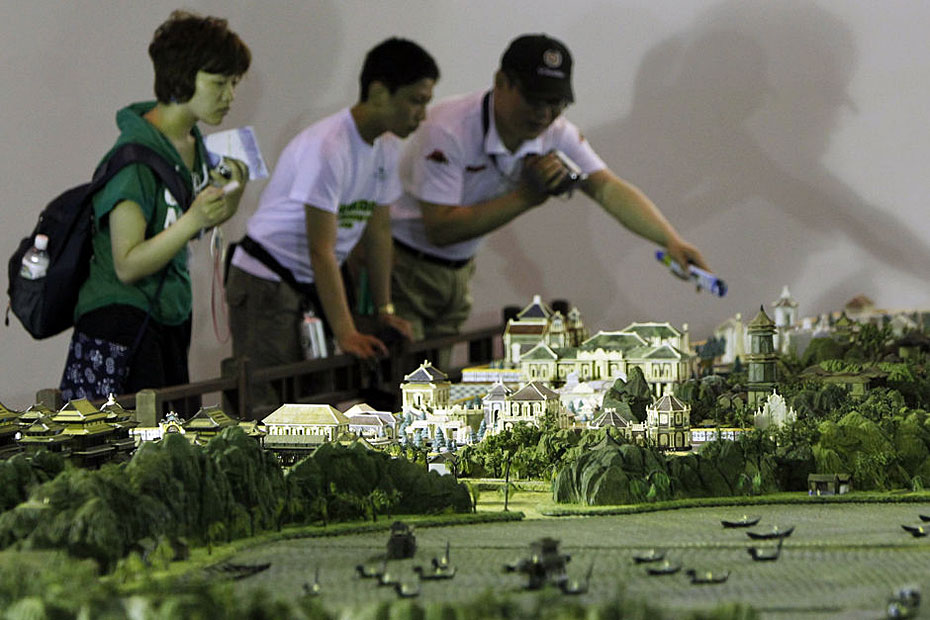 5月4日,游客在參觀縮微版“圓明園”。近日,一座“全景式巨型立雕圓明園”在上海世博會(huì)世界貿(mào)易中心協(xié)會(huì)館亮相。這座縮微版的“圓明園”以1比150的比例制作而成,再現(xiàn)了全盛時(shí)期的圓明園雄偉壯觀的全景。圖片來(lái)源:新華網(wǎng) 裴鑫 攝