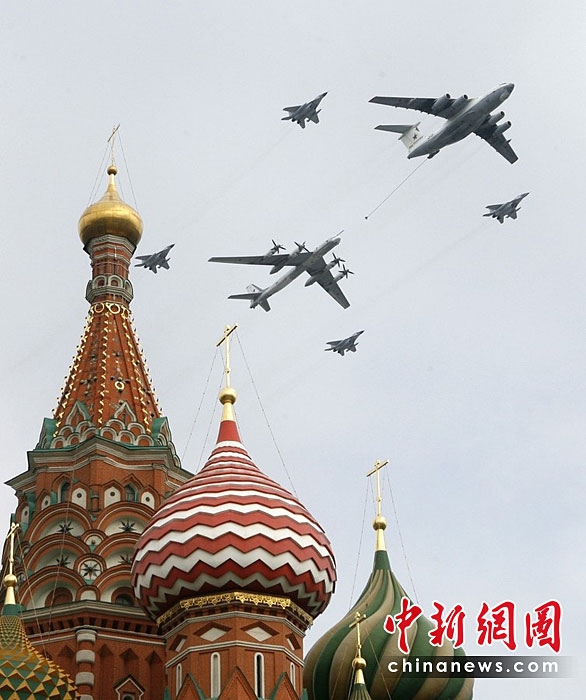 當(dāng)?shù)貢r(shí)間5月4日,在俄羅斯首都莫斯科,參加彩排的戰(zhàn)機(jī)編隊(duì)飛過紅場(chǎng)上空。俄羅斯將于5月9日隆重紀(jì)念衛(wèi)國戰(zhàn)爭(zhēng)勝利65周年。圖片來源:中國新聞網(wǎng)