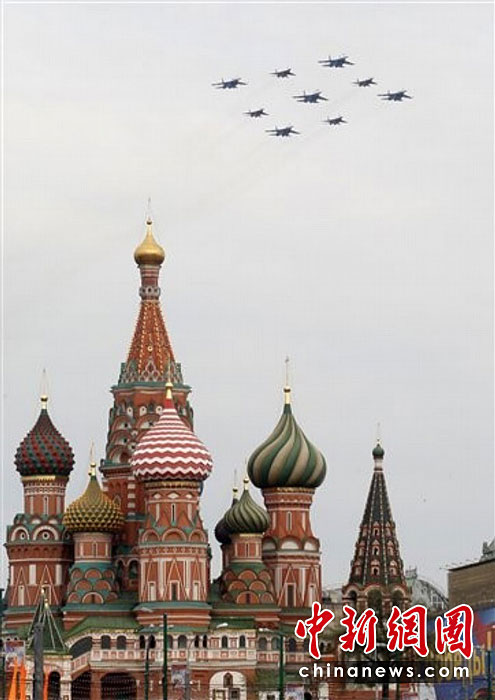 當?shù)貢r間5月4日,在俄羅斯首都莫斯科,參加彩排的戰(zhàn)機編隊飛過紅場上空。俄羅斯將于5月9日隆重紀念衛(wèi)國戰(zhàn)爭勝利65周年。圖片來源:中國新聞網(wǎng)