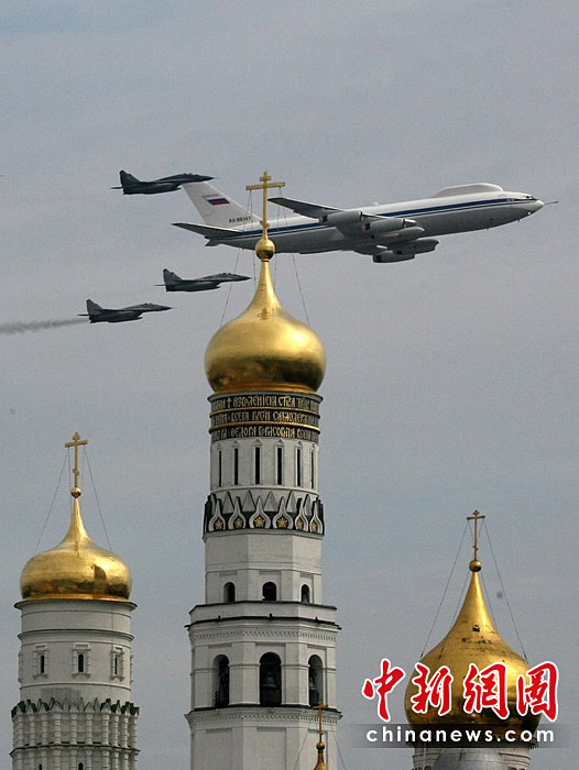 當(dāng)?shù)貢r(shí)間5月4日,在俄羅斯首都莫斯科,參加彩排的戰(zhàn)機(jī)編隊(duì)飛過(guò)紅場(chǎng)上空。俄羅斯將于5月9日隆重紀(jì)念衛(wèi)國(guó)戰(zhàn)爭(zhēng)勝利65周年。圖片來(lái)源:中國(guó)新聞網(wǎng)
