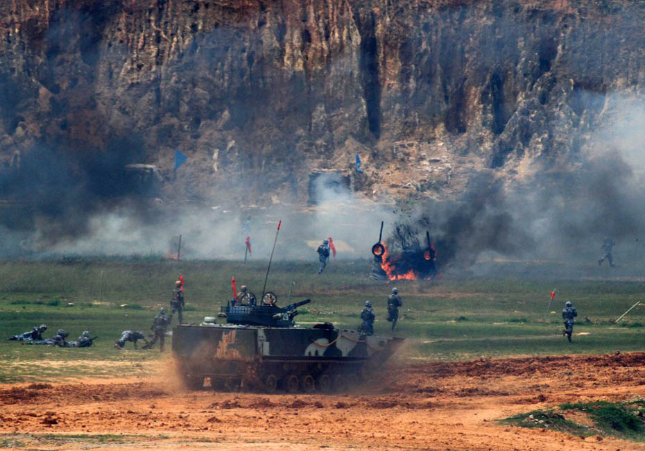 陸戰(zhàn)隊(duì)在訓(xùn)練場(chǎng)進(jìn)行登陸作戰(zhàn)實(shí)兵實(shí)彈演練。圖片來(lái)源:新華網(wǎng) 查春明攝