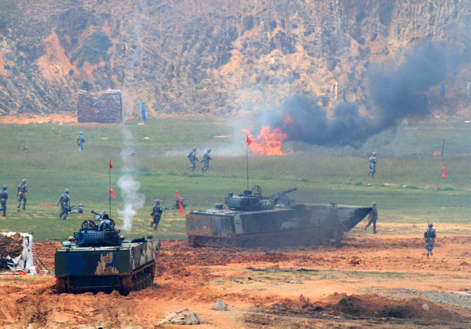 5月5日,海軍陸戰(zhàn)隊在訓(xùn)練場進(jìn)行登陸作戰(zhàn)實兵實彈演練。圖片來源:新華網(wǎng) 查春明攝