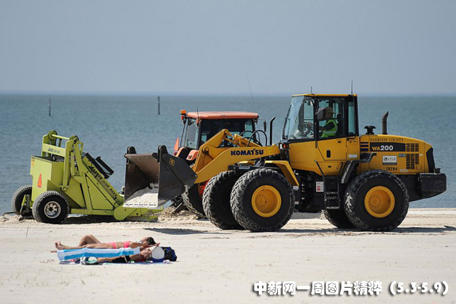 5月4日周二,在美國(guó)密西西比州加爾波特的一處海灘上,人們?cè)谙硎苋展庠,根本不理?huì)旁邊駛過(guò)的重型機(jī)械車。