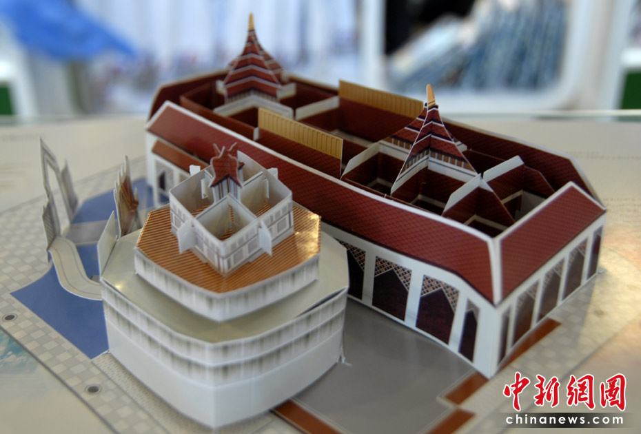 世博園區(qū)內(nèi)的特許商品店里,折紙場館惟妙惟肖,頗受游客的喜愛。圖為泰國館紙模型。中新網(wǎng)記者 吳歆 攝