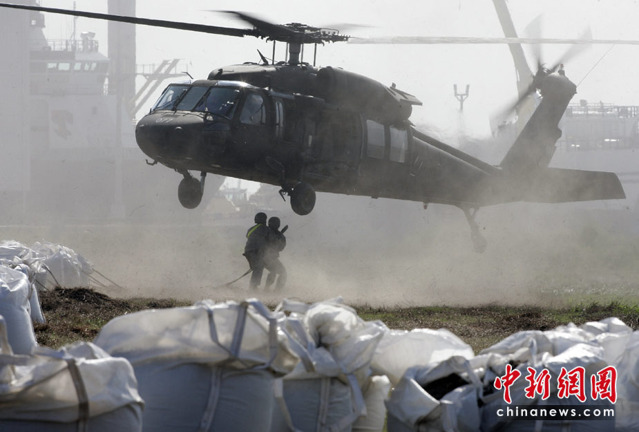 5月11日,美國路易斯安那州,國民警衛(wèi)隊(duì)用直升機(jī)向河口運(yùn)載沙袋,試圖阻止海上的油污進(jìn)入內(nèi)河。