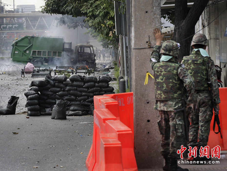泰國(guó)政府軍和反政府示威者5月14日深夜在曼谷爆發(fā)嚴(yán)重暴力沖突。曼谷緊急醫(yī)療機(jī)構(gòu)15日稱,截止當(dāng)?shù)貢r(shí)間早晨6時(shí),沖突已導(dǎo)致16人死亡,至少141受傷,傷者中包括3名外國(guó)人。圖片來源:中國(guó)新聞網(wǎng)