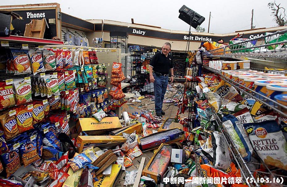 周二(11日),在美國俄克拉荷馬市東部的一處卡車休息站,沃倫·華爾滋(Warren Waltz)查看受災(zāi)情況。龍卷風(fēng)周一襲擊了美國南部平原,當(dāng)時(shí)汽車被吹離高速公路,房屋被掀翻,目前已有至少五人遇難。