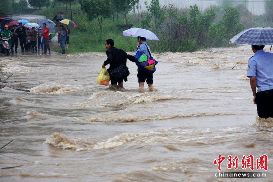 2010年5月18日,江西省婺源縣太白鎮(zhèn)朱村村民在當(dāng)?shù)毓哺删淖o(hù)送下通過被淹公路橋。當(dāng)日,江西全省近50個縣出現(xiàn)普降暴雨,其中婺源縣、 降雨量以婺源縣153毫米為最大,當(dāng)?shù)匾丫o急轉(zhuǎn)移群眾4000余人。到筆者發(fā)稿止,在該縣太白鎮(zhèn)通往德興市的主要公路被迫中斷,樂安河太白段水位均已超出警界線。卓忠偉/CFP