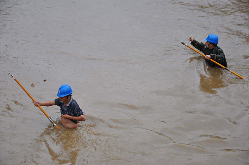 5月18日,婺源縣兩名電力工人走在齊腰深的洪水中。單長(zhǎng)華 攝 (圖片來(lái)源:新華網(wǎng))