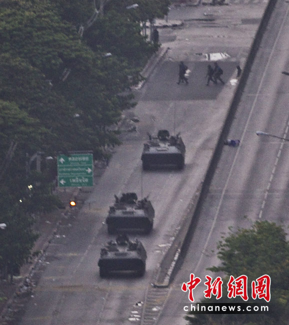 19日清晨,數(shù)百名軍警在武裝車輛的掩護下向反政府示威者在曼谷的大本營聚集。自上周四紅衫軍與政府在曼谷爆發(fā)沖突以來,已經(jīng)導致39人死亡,數(shù)百人受傷。