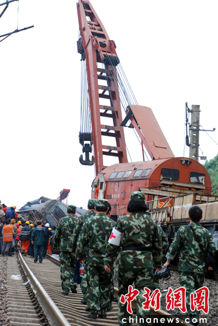 5月23日凌晨2時10分,滬昆鐵路江西東鄉(xiāng)段發(fā)生一起客運列車脫線事故,截至上午9時,已有10人遇難,車內(nèi)乘客全部被轉(zhuǎn)移,現(xiàn)場救援工作正在緊張進行。事故發(fā)生后,南京軍區(qū)武警,江西省消防、交警,中鐵電氣化局、醫(yī)療等部門立即組織近萬名人員參與搶險救災(zāi),目前現(xiàn)場已有10余臺挖土機和吊車參與救援。中新社發(fā) 劉占昆 攝