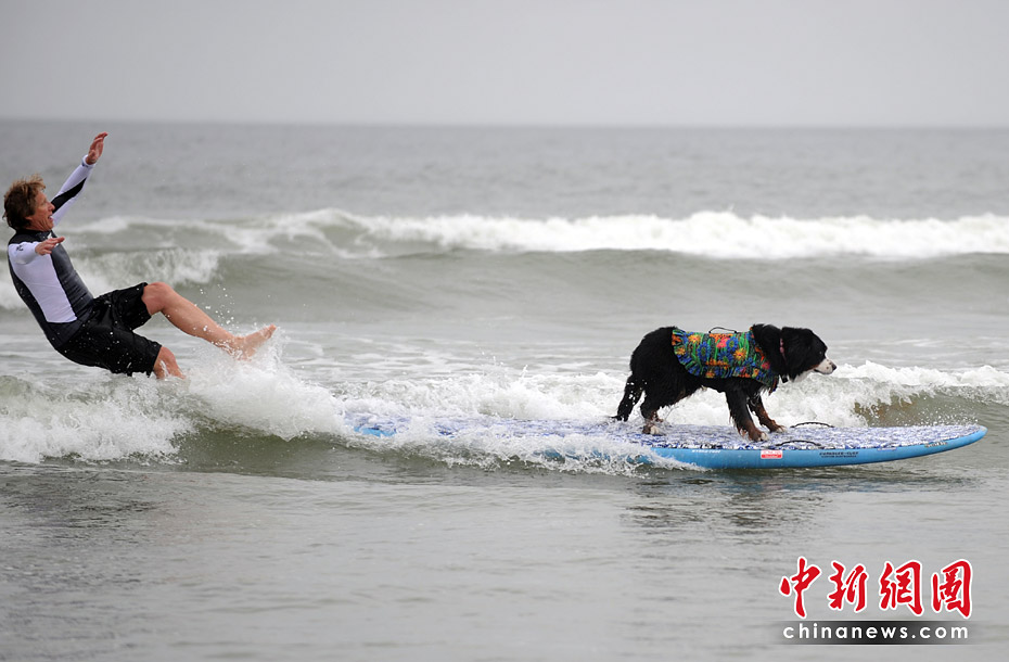 5月22日,美國(guó)加利福尼亞州圣迭戈舉行了一場(chǎng)妙趣橫生的狗狗沖浪比賽。圖片來(lái)源:中國(guó)新聞網(wǎng)