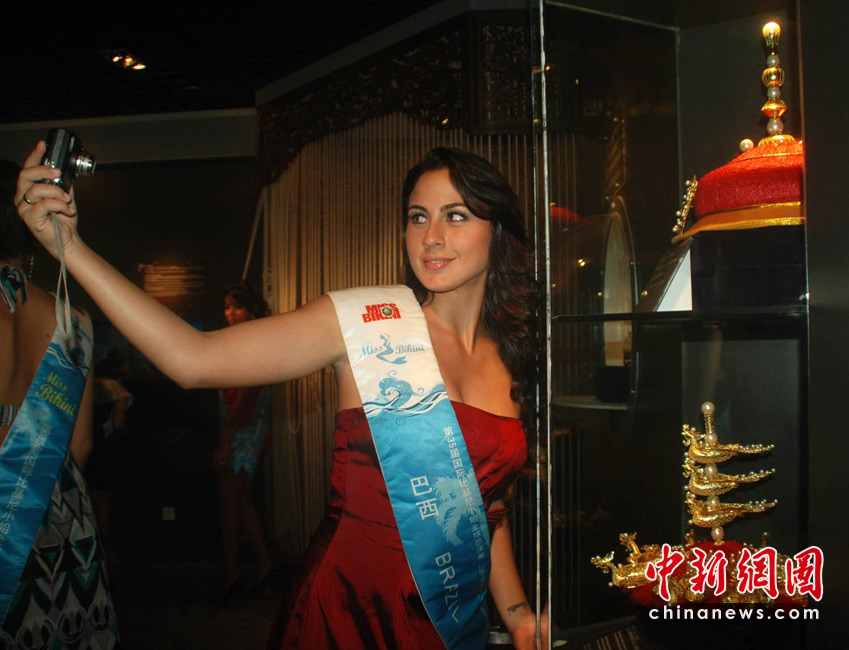 5月24日,海南三亞,正在此間參加第35屆國際比基尼小姐全球總決賽的64位佳麗,參觀了三亞一家珍珠博物館。佳麗們對漂亮的珍珠十分鐘愛,在攝影師前擺出各種“POSE”,留下美麗身影。圖為佳麗對漂亮的中國清朝時期皇后的皇冠(仿制品)興趣濃厚。中新社記者 尹海明攝
