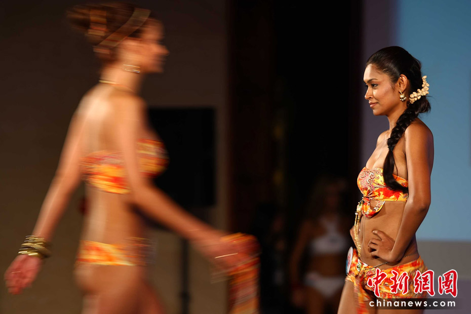 5月24日晚,在海南三亞參加第35屆國際比基尼小姐全球總決賽的64位各國佳麗們,展開了比基尼泳裝DIY設(shè)計和最佳身材的比拼。最終來自西班牙與烏克蘭的組合Marrero和Struk獲得了泳裝DIY設(shè)計的金獎。泰國佳麗Prapahan摘得最佳身材的桂冠。圖為佳麗們在展示自己設(shè)計的泳裝。中新社記者 富田 攝