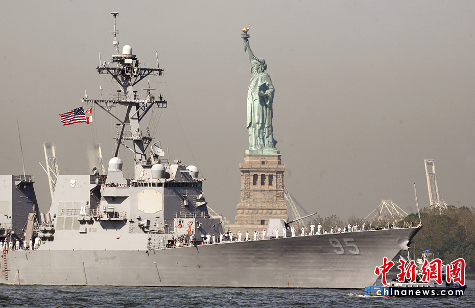 當?shù)貢r間5月26日,美國第23屆紐約艦隊周開幕,包括“硫磺島”號兩棲攻擊艦在內(nèi)的11艘參加艦隊周活動的軍艦由南向北在哈得孫河面上游弋。紐約民眾將以?吭诼D哈得孫河86號碼頭的“無畏號”航母博物館為中心,展開為期一周的慶祝和紀念活動。圖片來源:中國新聞網(wǎng)