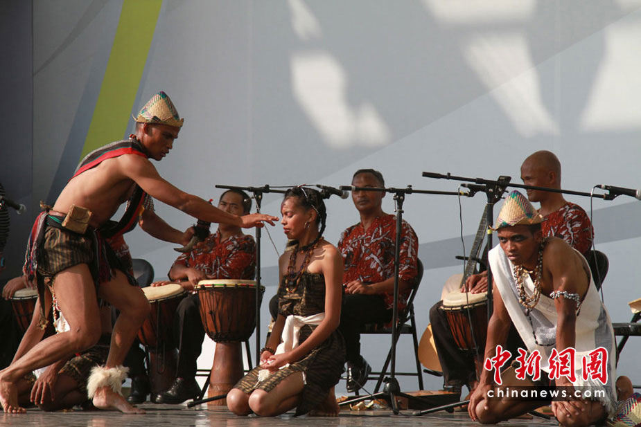 5月30日,馬達(dá)加斯加肯特思米諾歌舞團(tuán)在世博園非洲廣場(chǎng)表演比洛傳統(tǒng)儀式,逼真的神態(tài)、激情的表演,博得許多參觀者稱(chēng)贊。當(dāng)天是馬達(dá)加斯加館日,世博中心內(nèi)舉行了其國(guó)家館日活動(dòng),馬方和中方代表共同出席。中新社記者 殷春永 攝