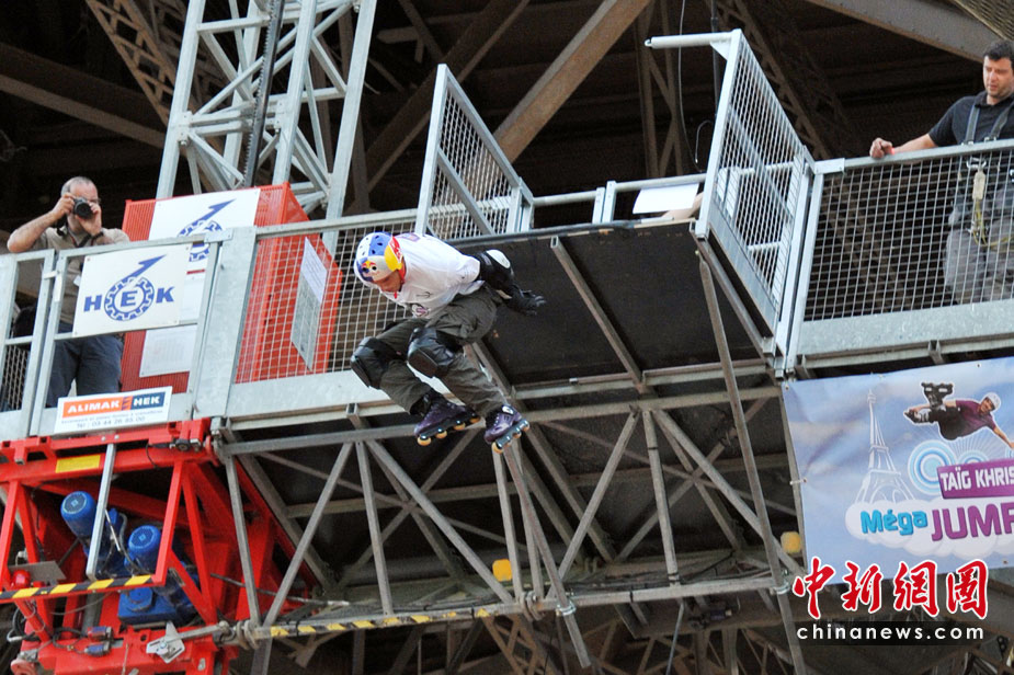 5月29日,法國(guó)巴黎,法國(guó)極限直排輪冠軍克里斯(Taig Khris)從法國(guó)艾菲爾鐵塔跳下,創(chuàng)下世界新自由落體紀(jì)錄。