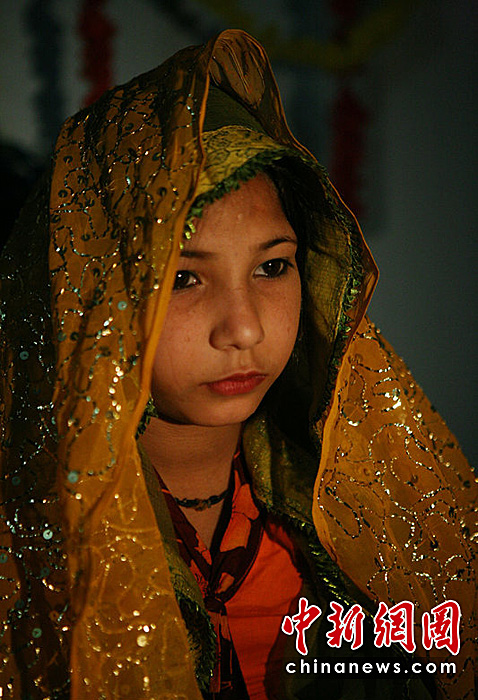 盡管在巴基斯坦童養(yǎng)媳是違法的,但這也是一個普遍存在的現(xiàn)象。近日,26歲的Shahir與12歲的Nasrin結(jié)為夫妻。Nasrin的爸爸是在兩年前去世的。因為經(jīng)濟困難,Nasrin被迫出嫁。圖片來源:CFP
