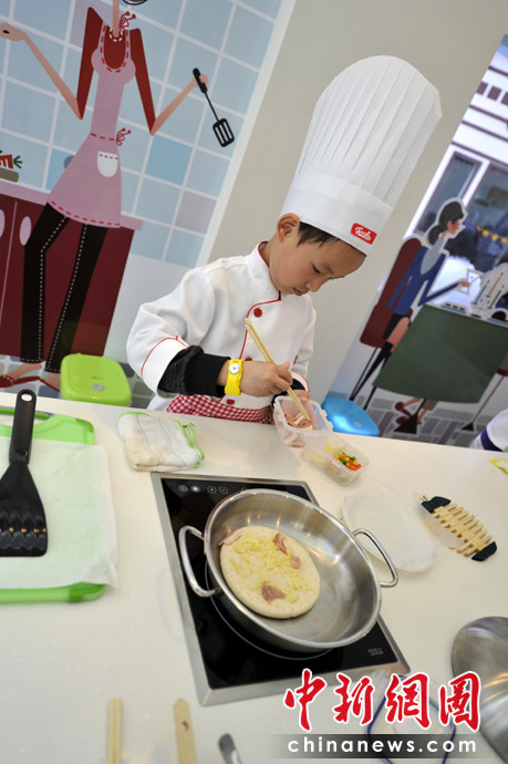 圖為“小廚師”在做批薩。 中新網記者 王紅綱 攝