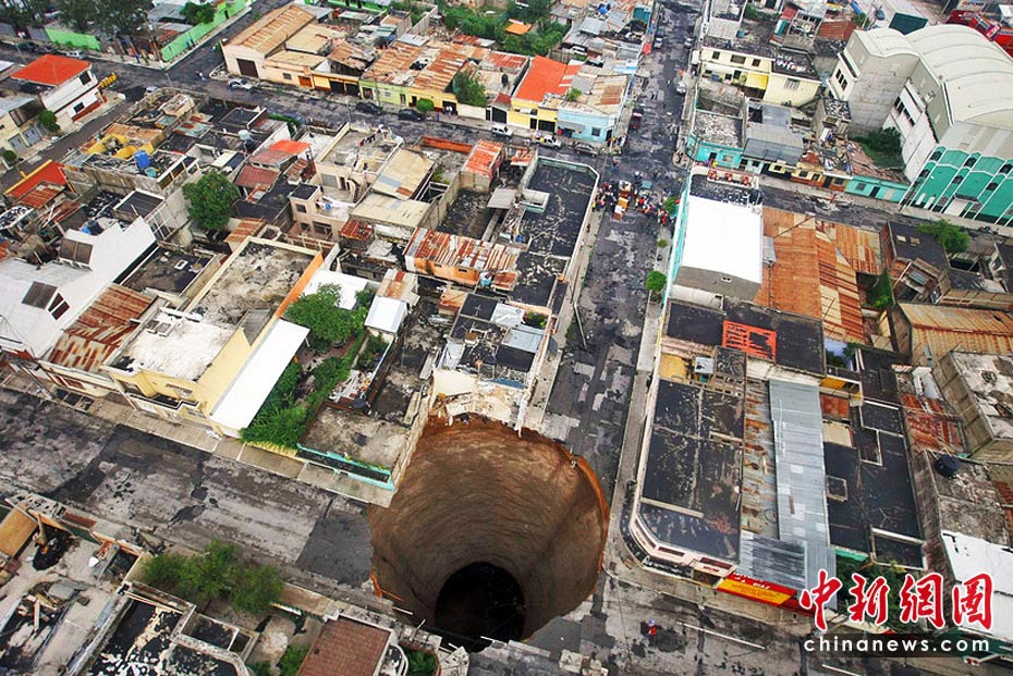 5月31日,受颶風(fēng)“阿加莎”的影響,危地馬拉首都危地馬拉城出現(xiàn)一個(gè)深達(dá)60米塌陷洞,有目擊稱一幢3層建筑墜入洞中,至少造成1人死亡。圖片來源:中國新聞網(wǎng)