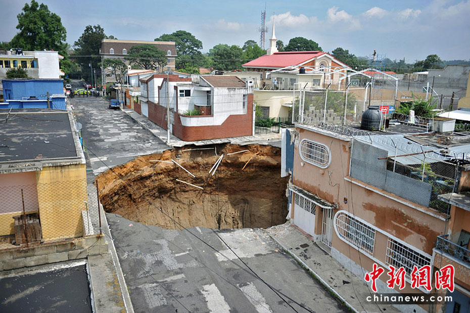 5月31日,受颶風(fēng)“阿加莎”的影響,危地馬拉首都危地馬拉城出現(xiàn)一個(gè)深達(dá)60米塌陷洞,有目擊稱一幢3層建筑墜入洞中,至少造成1人死亡。圖片來(lái)源:中國(guó)新聞網(wǎng)
