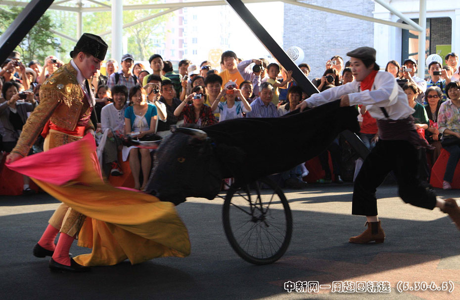 新近,上海世博園區(qū)里的各種趣味演出連連,西班牙斗牛士與一頭假公牛相互角逐,讓眾多游客樂開懷。圖片來源:中國新聞網(wǎng)>>點(diǎn)擊觀看詳細(xì)內(nèi)容