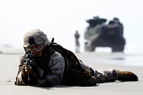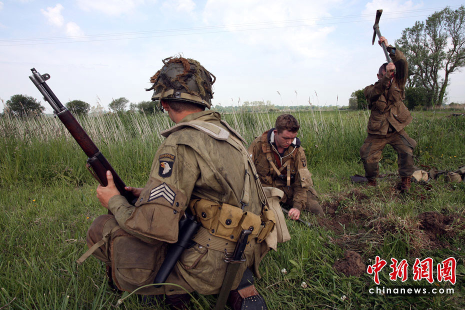 6月5日,諾曼底登陸66周年前夕,一批演員身著二戰(zhàn)時(shí)期美軍軍服,在法國諾曼底卡倫坦重現(xiàn)了這次著名的戰(zhàn)役。