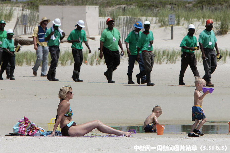 周二(1日),美國(guó)阿拉巴馬州海岸,人們?cè)诤_厱裉,石油工人在后面走過。墨西哥灣漏油事件已經(jīng)開始影響到該地區(qū)的旅游。