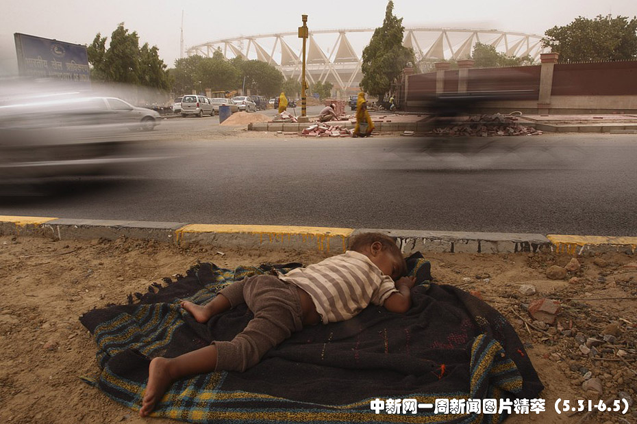 周四(3日),印度新德里,英聯(lián)邦運(yùn)動(dòng)會(huì)即將開(kāi)幕。圖為一個(gè)孩子路邊熟睡。