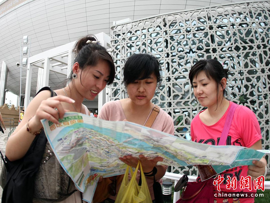 截至6月5日19點30分,上海世博會累計參觀者已超過1000萬人次。據(jù)悉,上海世博會的規(guī)劃用地為5.28平方公里,約242個國家和國際組織參展分布在浦東和浦西兩大區(qū)域。要想在這么大的地方找到自己想去的地方,那么世博地圖就是必須的裝備。圖為上海世博園內游客正在地圖上尋找自己要去的地方。中新社記者 杜洋 攝