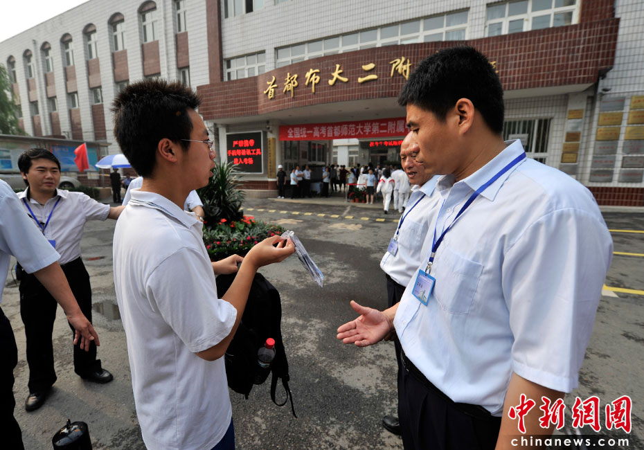 2010年全國高考6月7日日拉開大幕,957萬考生走進(jìn)考場。由于報(bào)名人數(shù)減少,而招生計(jì)劃增加,教育部預(yù)計(jì)今年全國高考平均錄取率將會增加近7%。圖為首都師范大學(xué)第二附屬中學(xué)考點(diǎn)。中新網(wǎng)記者 金碩 攝