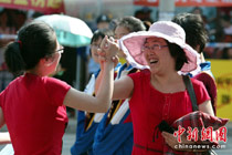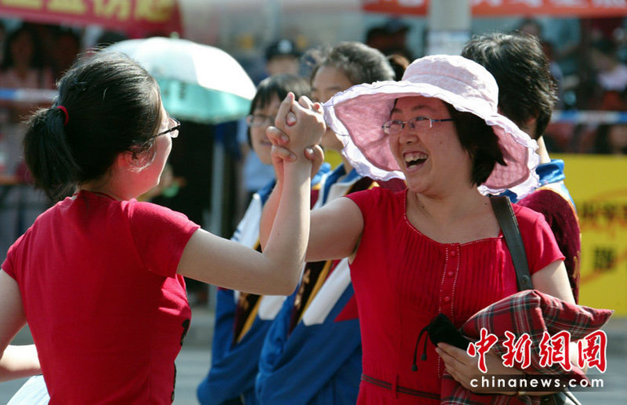 6月7日,為期兩天的2010年普通高等學校招生全國統一考試開考,全國將有957萬考生走進考場。圖為高考第一天,遼寧丹東一中考場外的老師鼓勵準備參加考試的學生獲得好成績。陳浩 攝