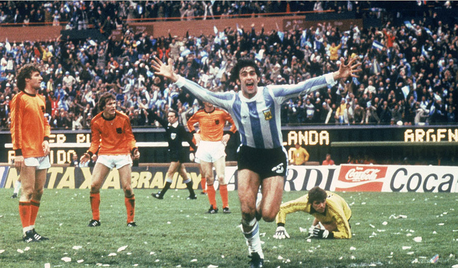 1978年,盡管荷蘭隊(duì)還是那么強(qiáng)大,但“全攻全守”在走下坡路,兩位劃時(shí)代的人物克魯伊夫和貝肯鮑爾退出各自國(guó)家隊(duì),阿根廷采用1962年巴西隊(duì)的4-3-3陣型,在河床體育場(chǎng)3比1擊敗荷蘭隊(duì)奪冠。 阿根廷的成功得益于主教練梅諾蒂的指揮以及一批球星的崛起。鐵門菲洛爾、隊(duì)長(zhǎng)帕薩雷拉、突破高手阿爾迪列斯。74年那屆阿根廷隊(duì)中只有肯佩斯和豪斯曼兩人入選78年陣容。當(dāng)然,最引人注目的是一頭長(zhǎng)發(fā)的肯佩斯,他是這屆世界杯的英雄……