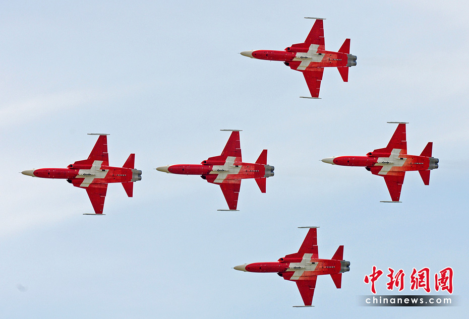 2010年柏林國際航空展于當?shù)貢r間6月8日在德國柏林舍內(nèi)費爾德機場開幕。9日,瑞士飛行表演隊在航展上演了精彩的飛行表演。圖片來源:中國新聞網(wǎng)
