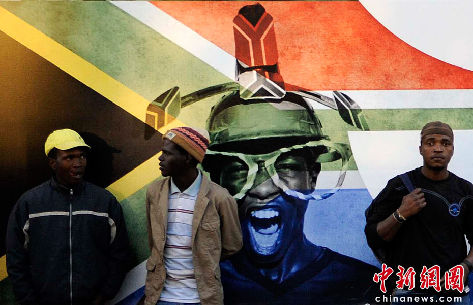 當(dāng)?shù)貢r(shí)間6月9日,民眾在南非約翰內(nèi)斯堡街頭的世界杯宣傳畫(huà)前,非洲大陸即將首次迎來(lái)足球世界杯。中新社發(fā) 廖攀 攝