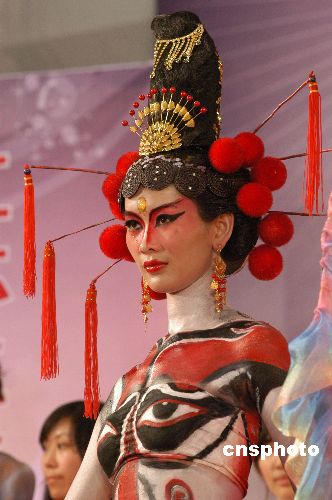 2007年11月3日,第九屆江蘇省美容美甲大賽在南京國際展覽中心舉行,參賽選手們用中國紅、京劇服飾等裝扮模特,使自己的作品在傳統(tǒng)文化和現(xiàn)代元素中相得益彰,成為大賽上十分靚麗的景致。中新社發(fā) 阿董 攝