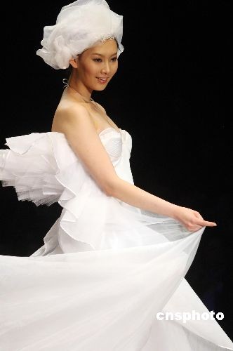 11月7日,“名瑞杯”2008中國婚紗設計大賽在北京中國國際時裝周上舉行,共有來自中國14個地區(qū)的25份稿件入圍了最后的決賽。參賽作品類型設計多樣化,有顏色和造型都很獨特的禮服,也有哥特式風格的新娘裝等,作品設計大膽新穎,使用夸張的造型,同時運用以點堆積成面的裝飾手法,在裙身上做出圖案或者肌理,來豐富服裝的整體內(nèi)容,F(xiàn)在的婚紗已經(jīng)不是婚禮的附屬品,而是慢慢的成為時尚亮點,新娘通過選擇婚紗來體現(xiàn)自己的個性和心情,婚紗成為一種特殊的媒介。圖為模特展示婚紗設計大賽作品。中新社發(fā) 錢興強 攝