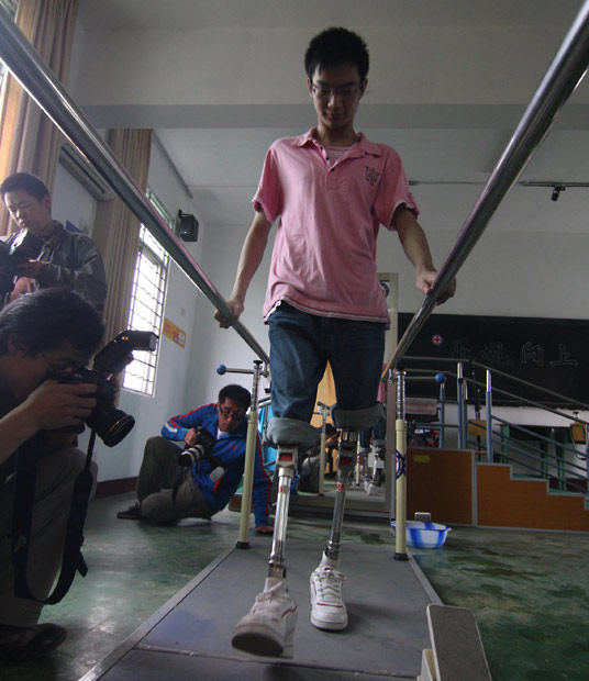 5月8日,“夾縫男孩”鄭海洋在四川省北川中學(xué)康復(fù)站進(jìn)行康復(fù)訓(xùn)練!皧A縫男孩”——北川中學(xué)高一學(xué)生鄭海洋在地震農(nóng)歷一周年5月2日重返校園,重新走入同學(xué)中間,開始新的生活。 在去年汶川大地震中,北川中學(xué)兩幢教學(xué)樓倒塌,正在高一·二班上課的鄭海洋與同桌廖波被同埋于水泥板下,22個(gè)小時(shí)后,鄭海洋獲救,付出的代價(jià)是他年輕健壯的雙腿。因與同桌廖波同埋于水泥板夾縫之中,被外界稱為“夾縫男孩”。將滿十八歲的鄭海洋,陽(yáng)光、帥氣?措娨暋⒖磿、上網(wǎng)是他的板房生活常態(tài),他穿戴假肢練習(xí)行走進(jìn)行康復(fù)訓(xùn)練,每次練習(xí)都要出一身大汗,F(xiàn)在的他已經(jīng)可以站立圍著板房區(qū)走一圈了。停學(xué)近一年的海洋進(jìn)入了新的高一·一班。母親跟他住在一間宿舍照顧他。新老師、新同學(xué)們也樂于關(guān)心他,為方便進(jìn)出專門安排他坐最后一排,下課時(shí),同學(xué)們會(huì)推著他到外面轉(zhuǎn)轉(zhuǎn)。學(xué)校給予鄭海洋每月三百元的生活補(bǔ)助,并在宿舍安排和生活上盡可能給予照顧。海洋穿上假肢可以行走,目前的臨時(shí)校區(qū)處在山坡地,上下坡假肢用不上力,只能坐輪椅。他希望即將開工的新北川中學(xué)能夠?yàn)闅埣矊W(xué)生設(shè)立更便利的無障礙通道。中新社發(fā) 郭國(guó)權(quán) 攝